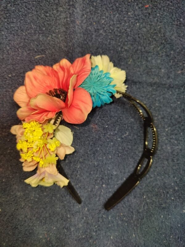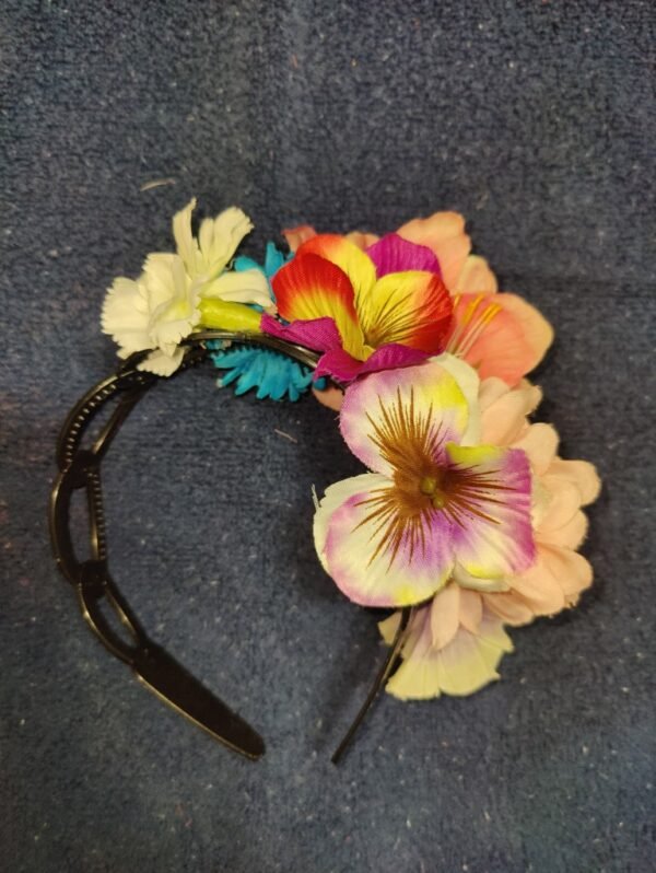 Side 1: purple morning glory, small pink mum, yellow plastic mini flowers, medium pink peony, small turquoise carnation.
