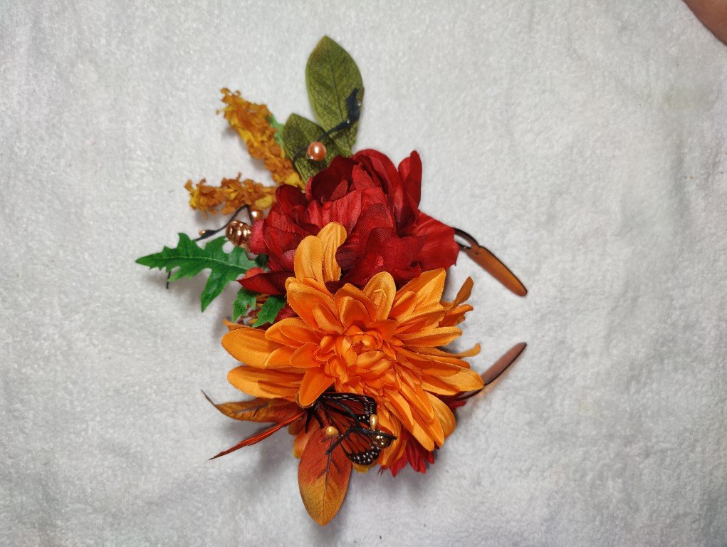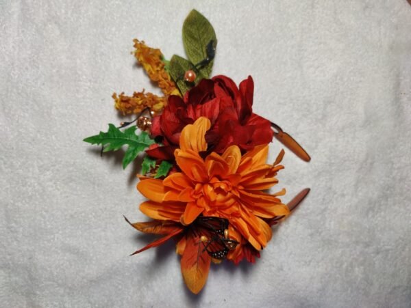 Side 1: 1 large orange mum, 1 large dark red rose, 1 dark red dahlia.