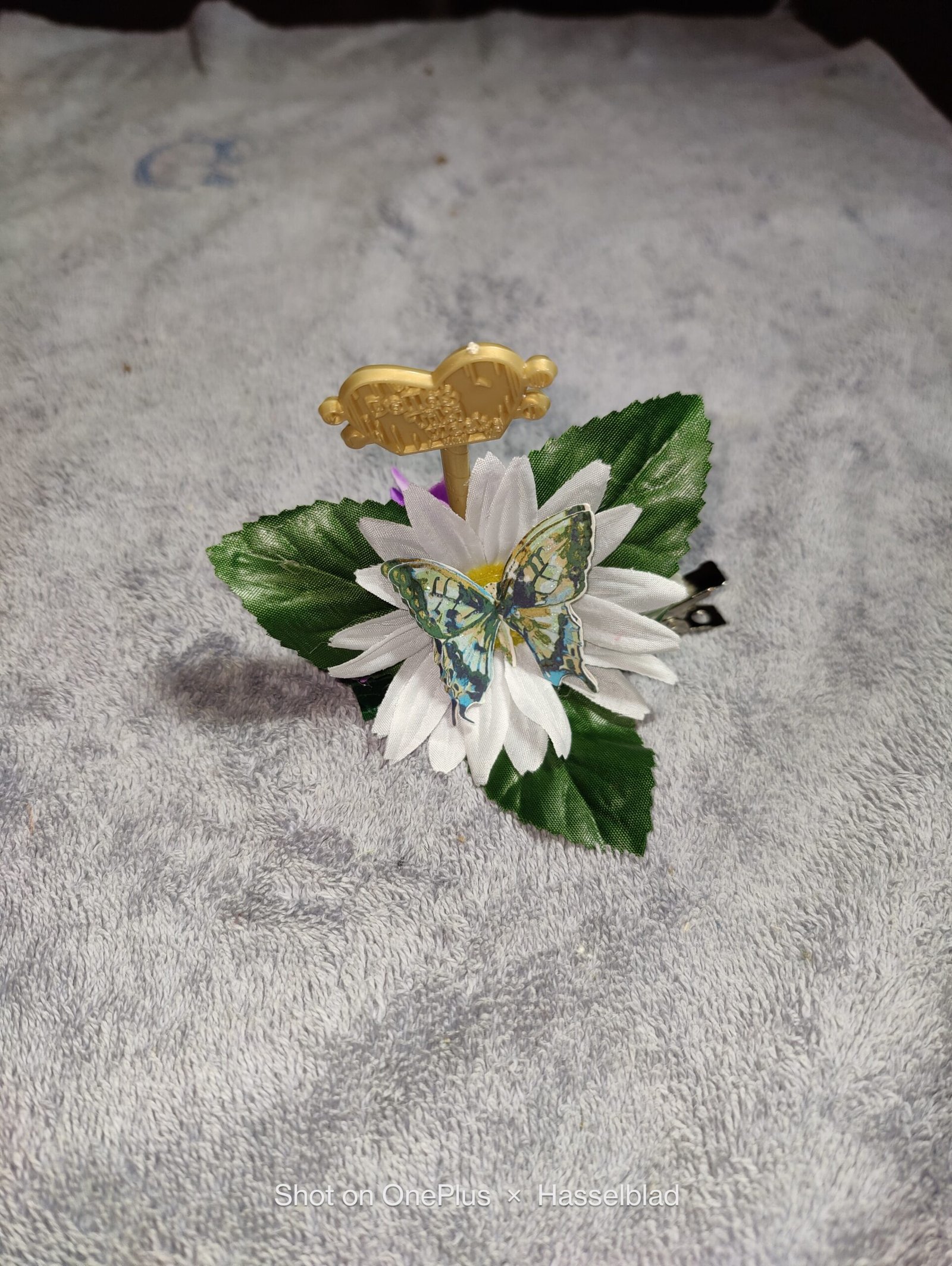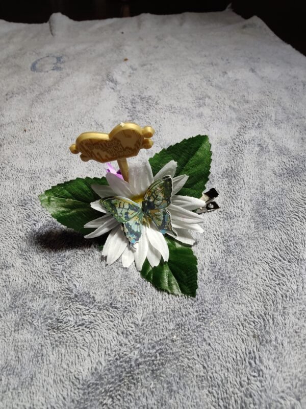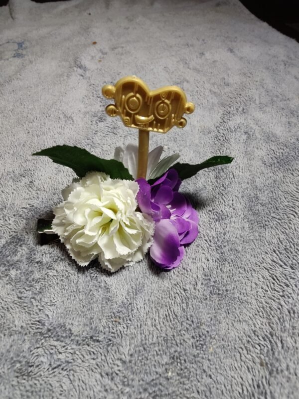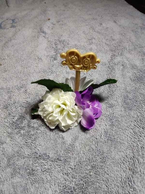 Dallas Tiki Week Carnation. White Carnation, purple accent flower, green leaves and Dallas Tiki Week swizzle. Size: 3″x2″x4″