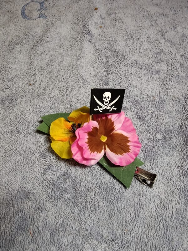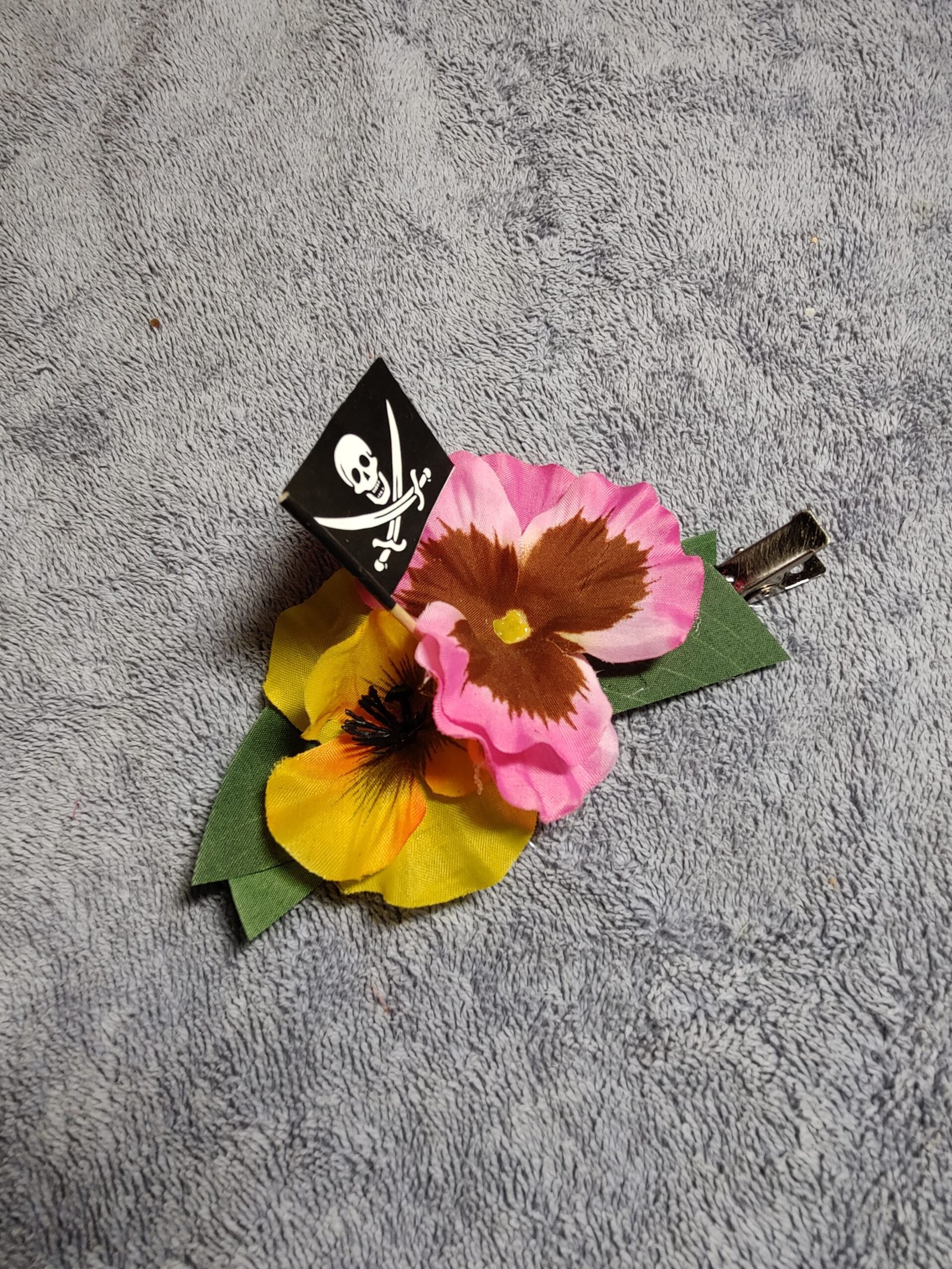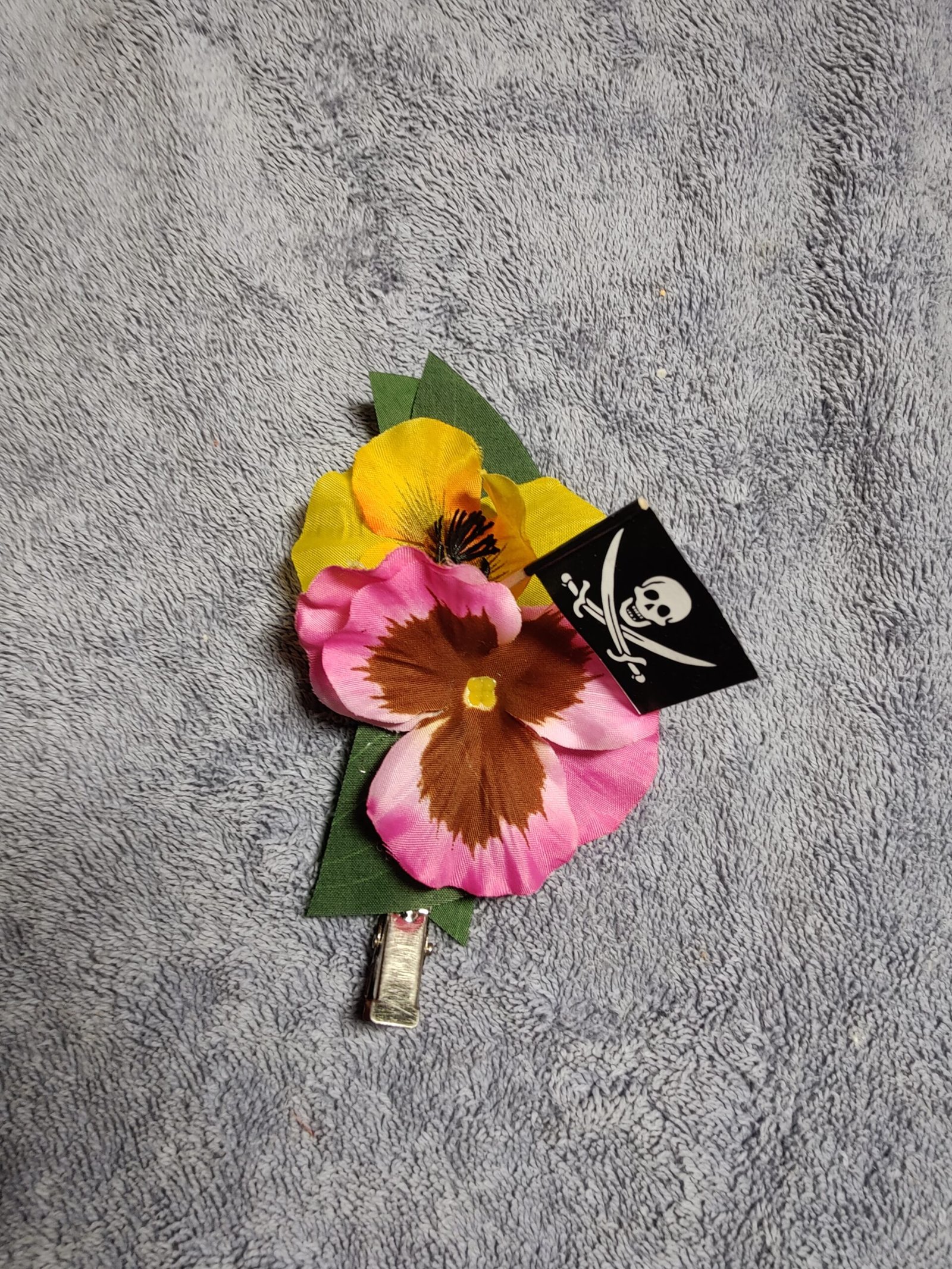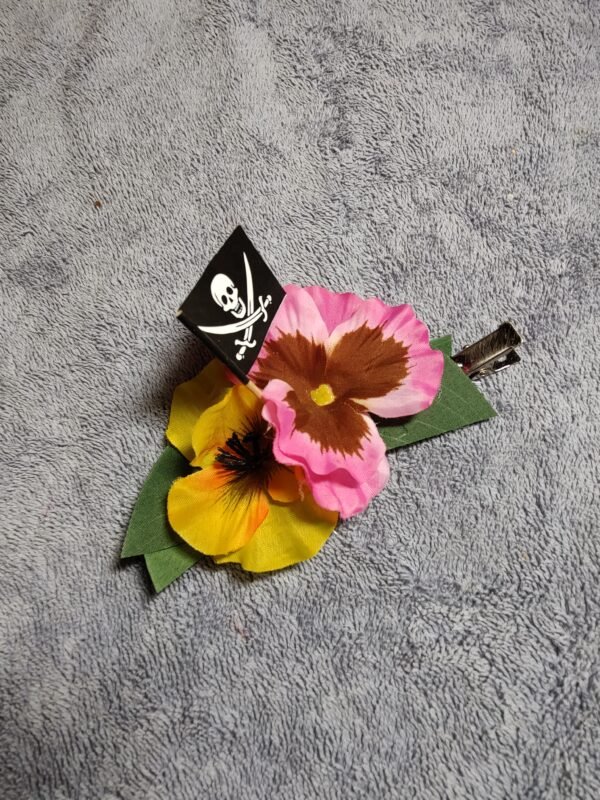 Clip is 4″ long with one yellow and one pink pansy with a paper pirate flag mounted on a leaf.