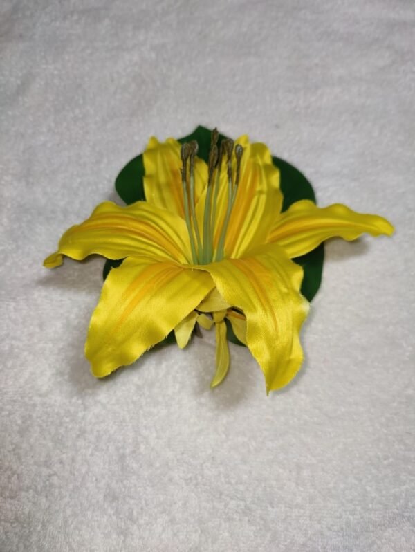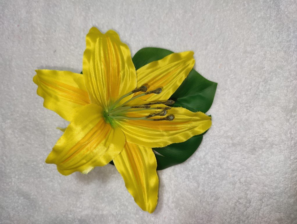 Large yellow lily measures 8″ based on a 5″ palm leaf.