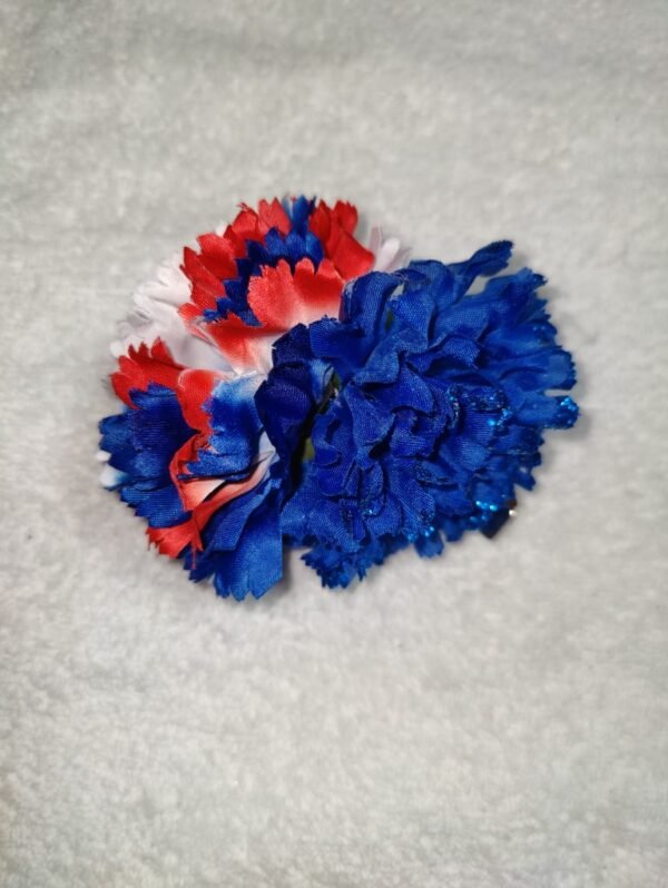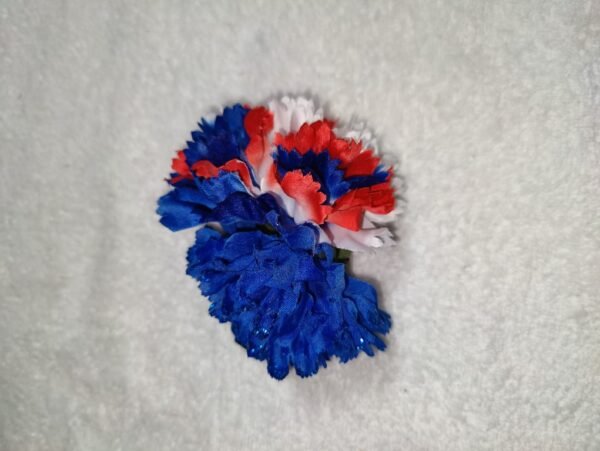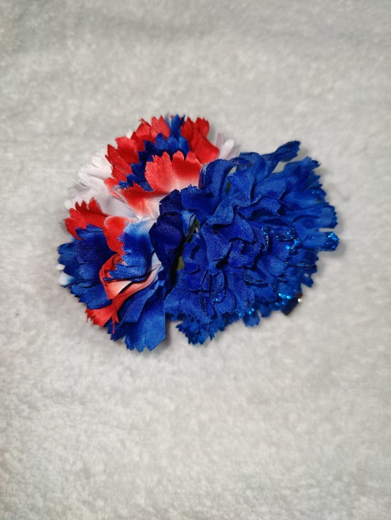 A 2 flower clip with one blue and one multicolored red, white, and blue carnation.