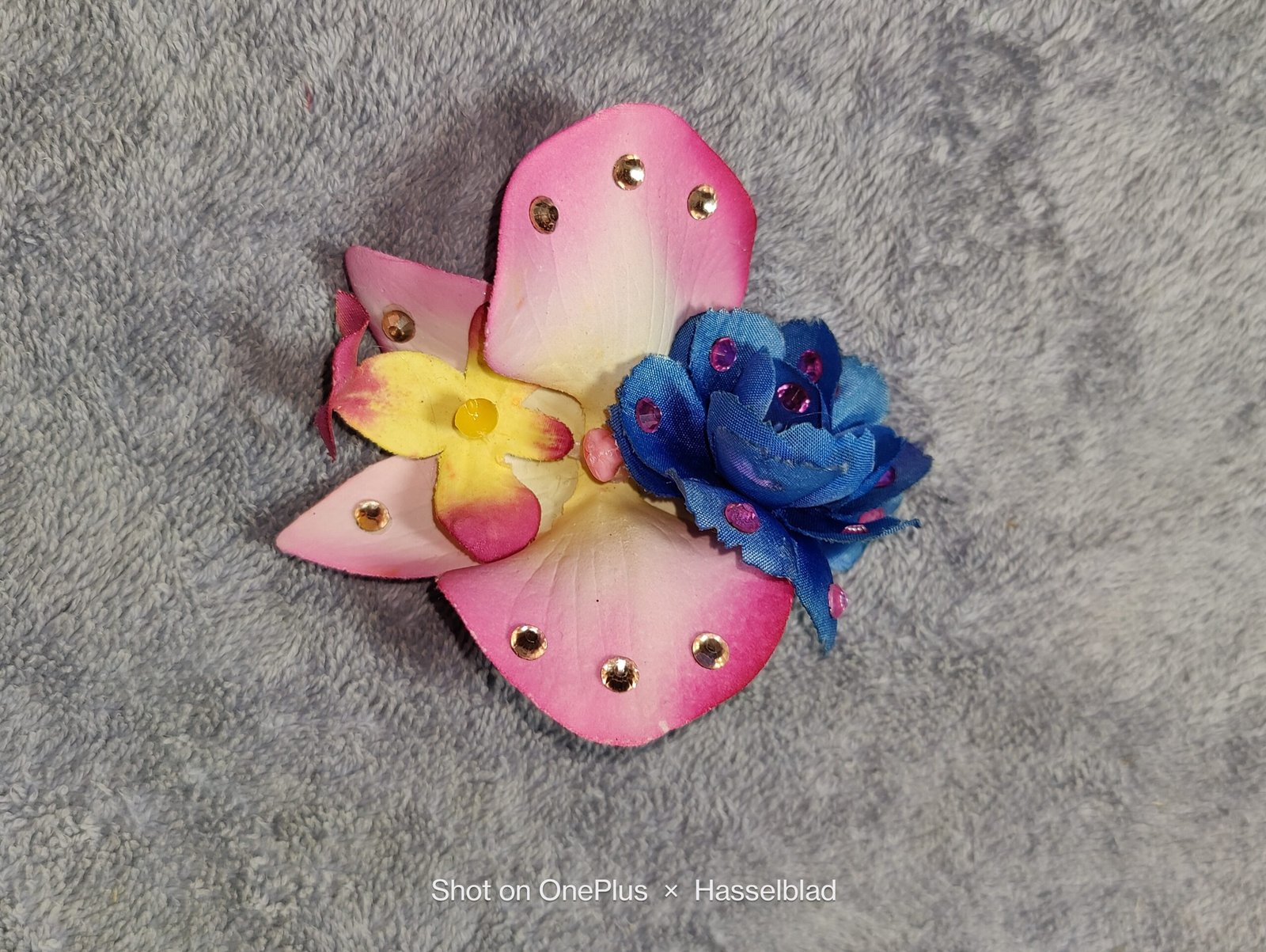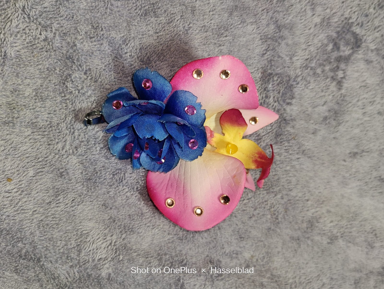 Pink Orchid. 1 pink orchid with light pink rhinestones, 1 blue cosmos with pink rhinestones.