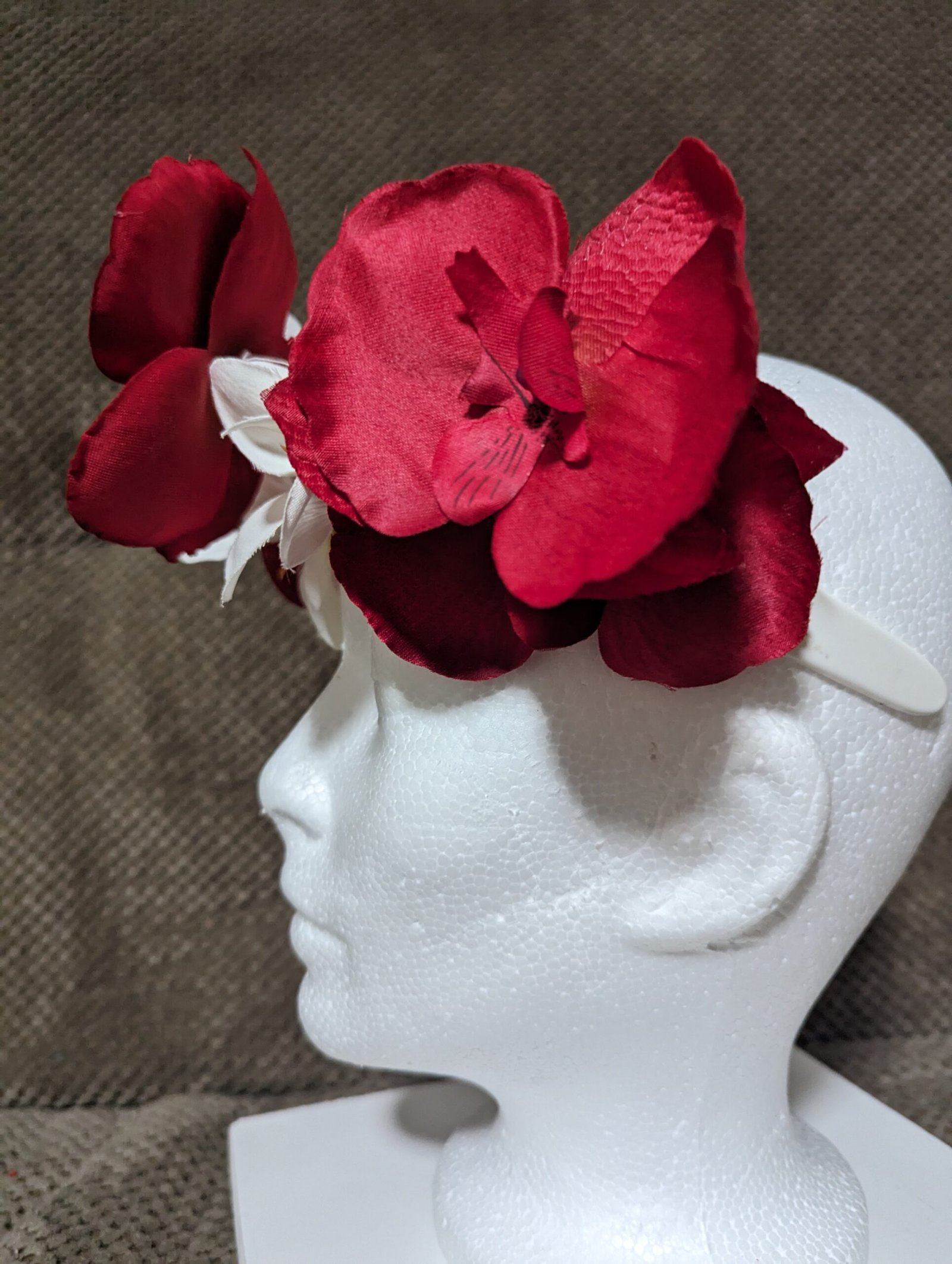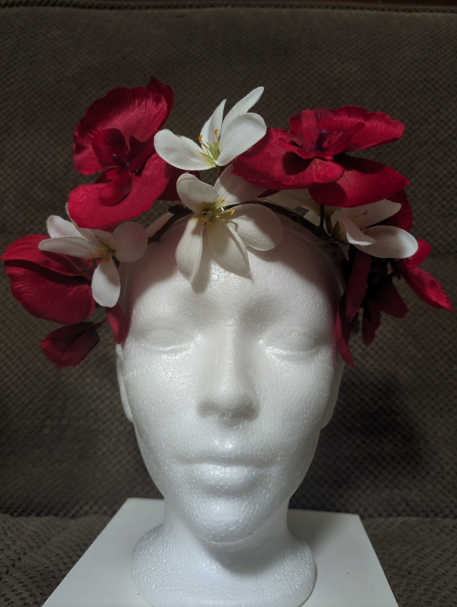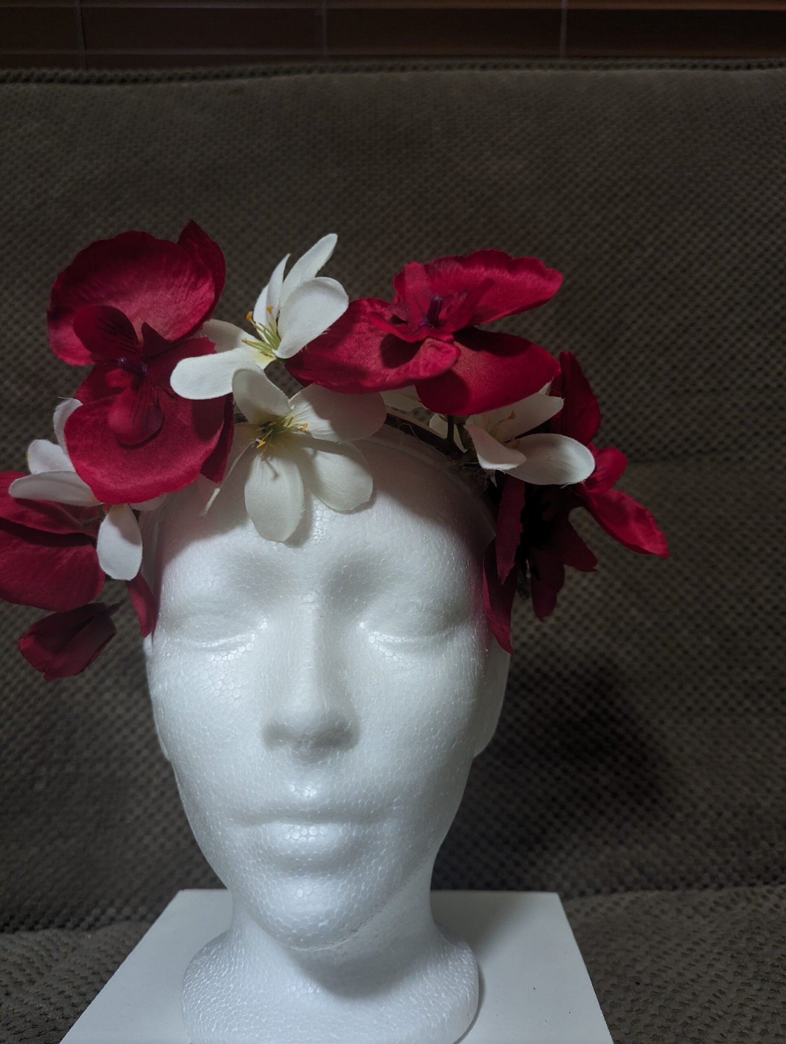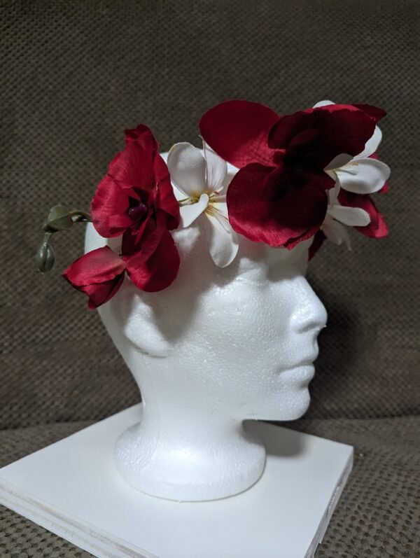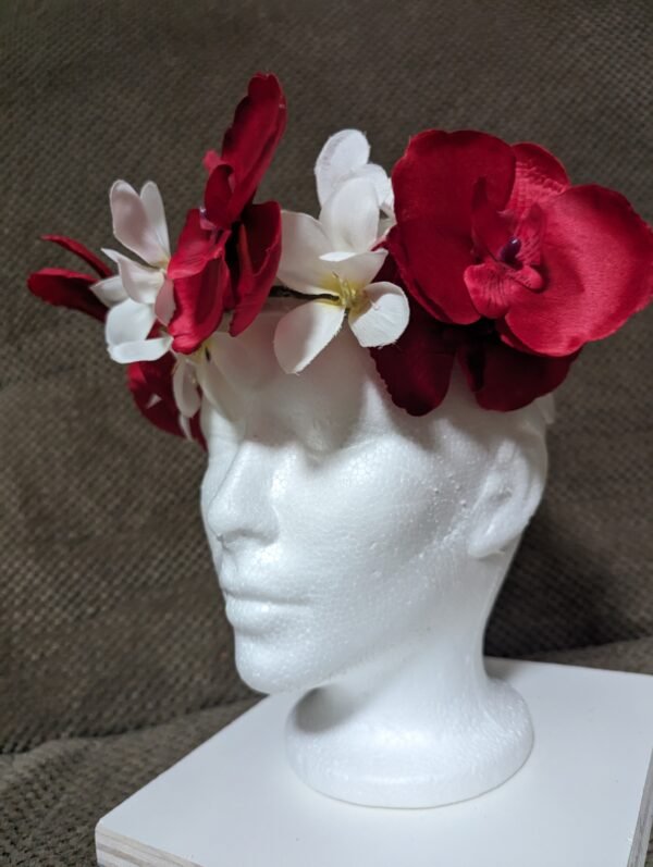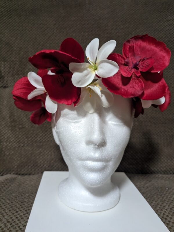 5 red orchids and 3 white plumeria