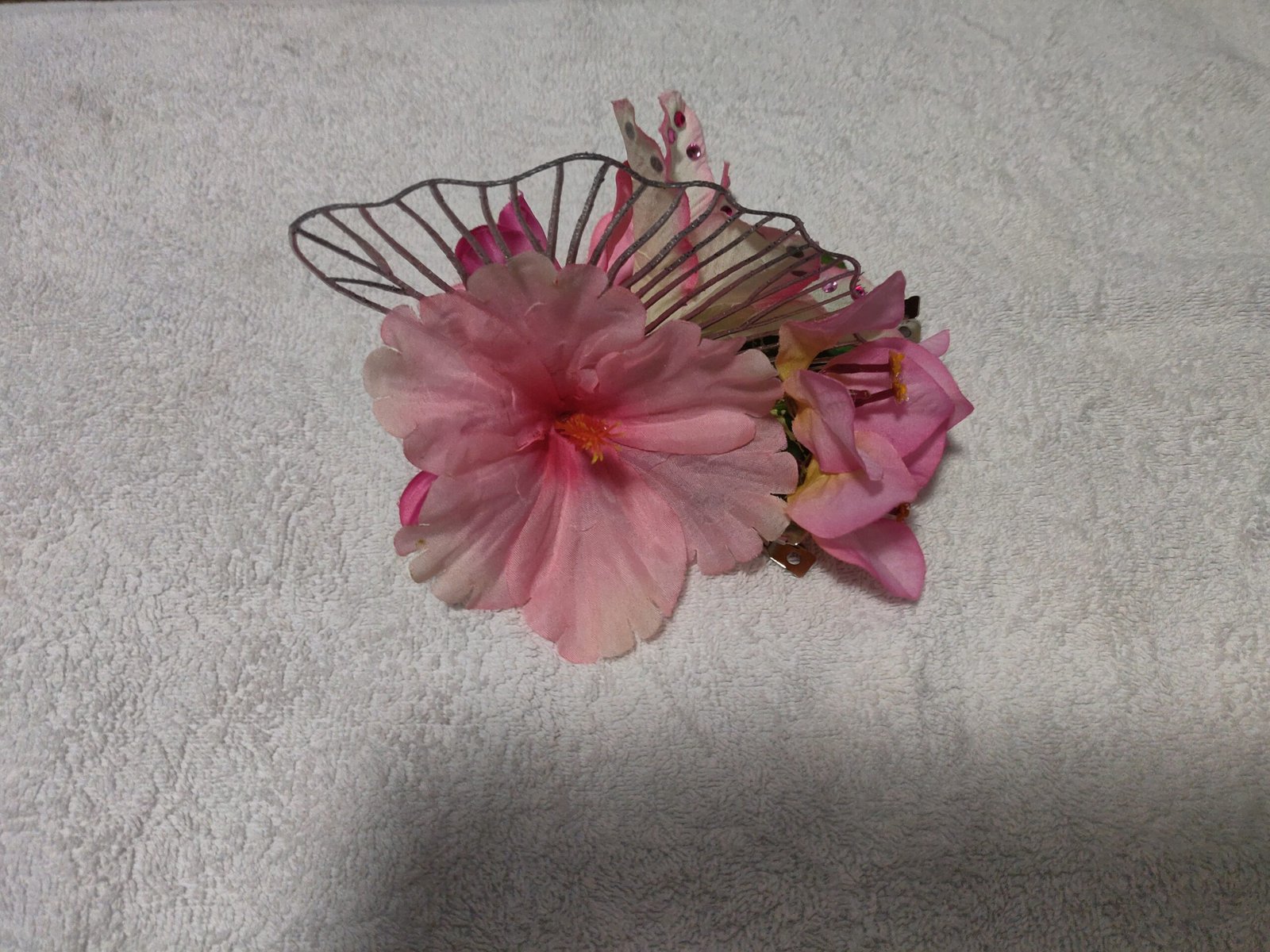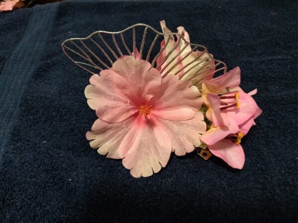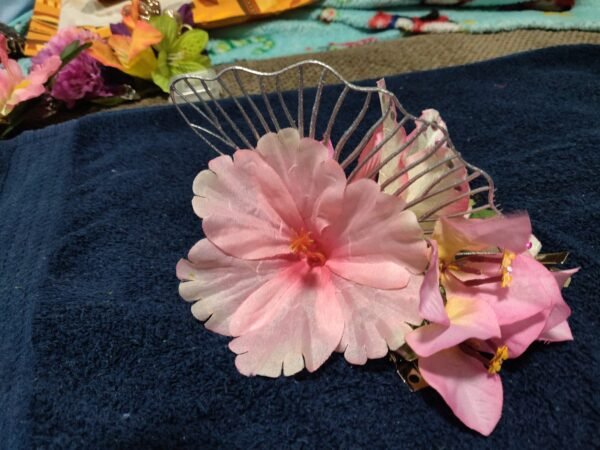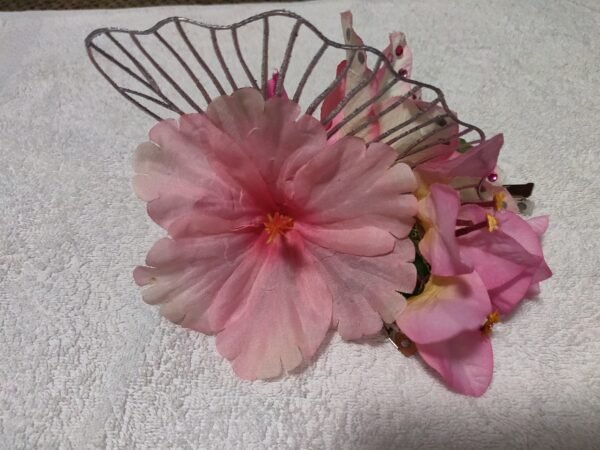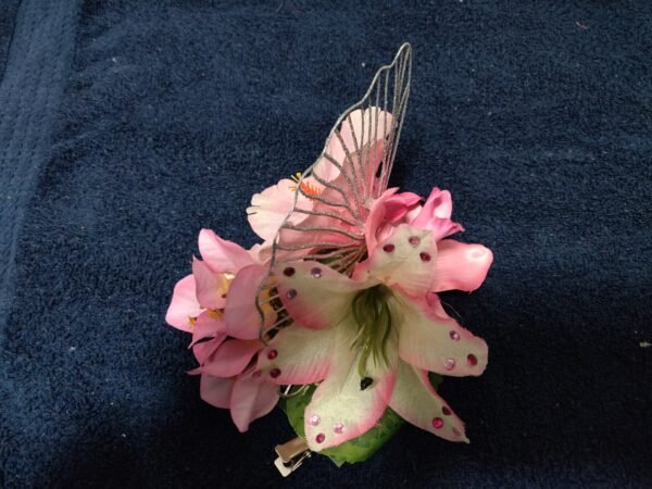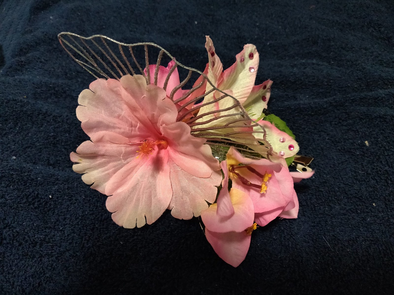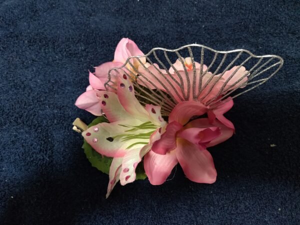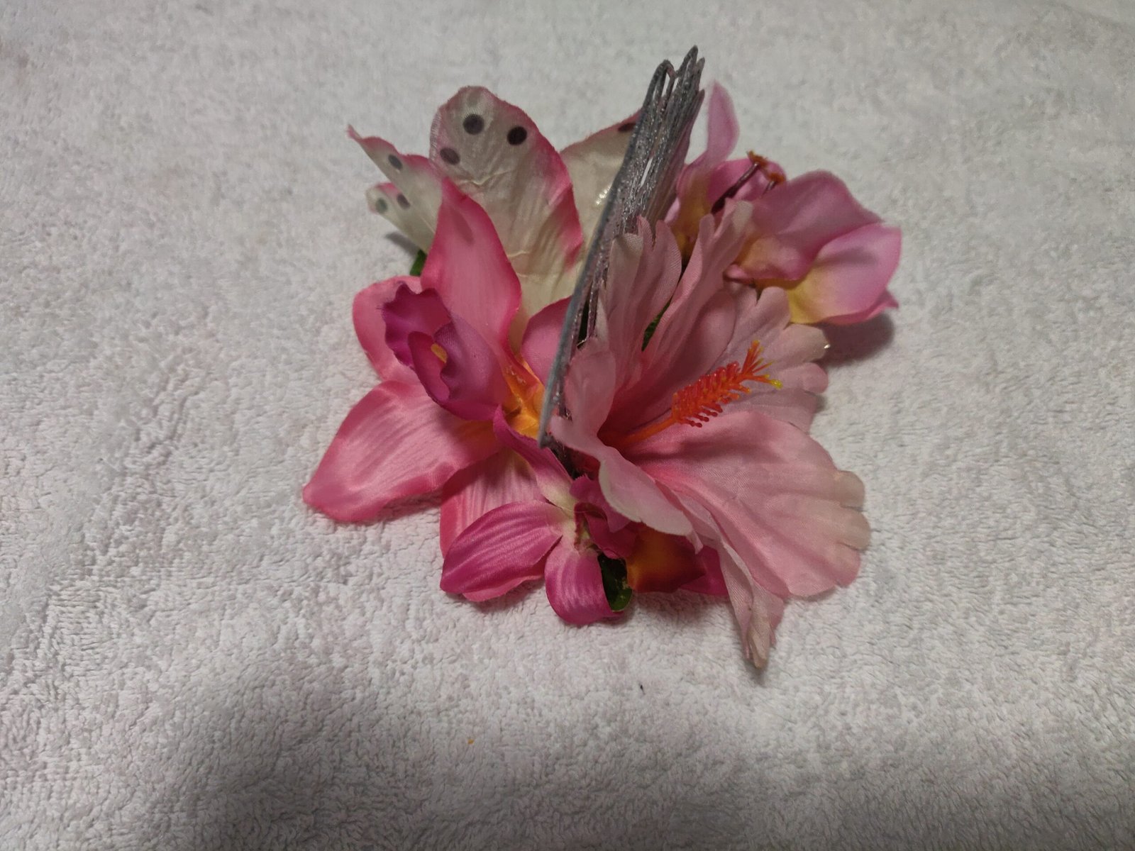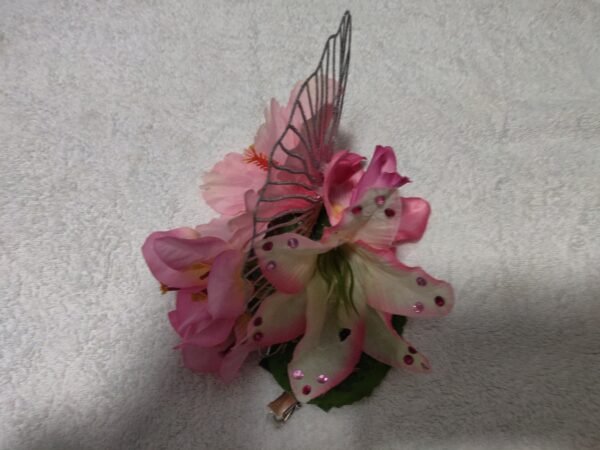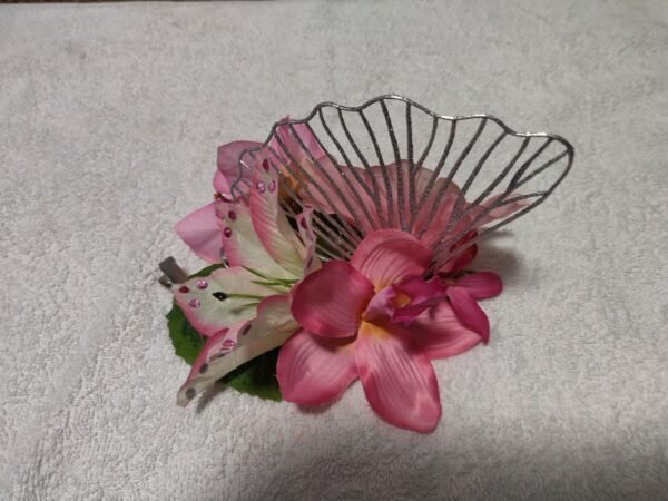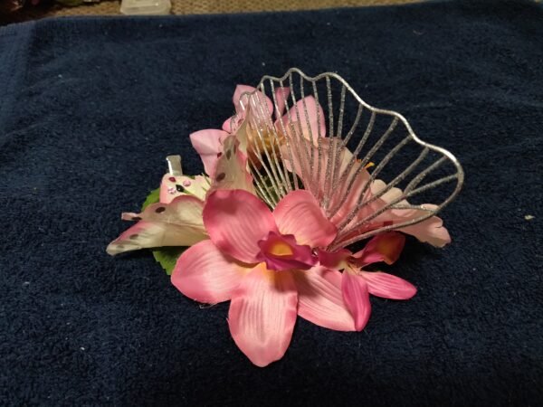 1 white/pink medium lily with pink rhinestones, 1 pink large orchid, 1pink large hybiscus, pink plumeria, silver coral skeleton