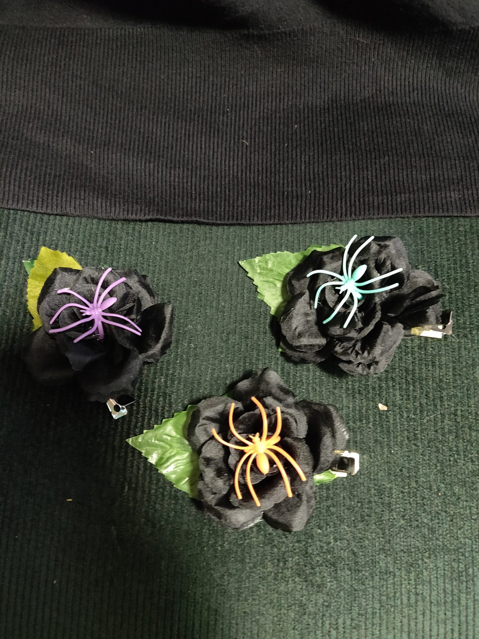 Black rose on green leaf with a tuquoise, orange, purple or spider,