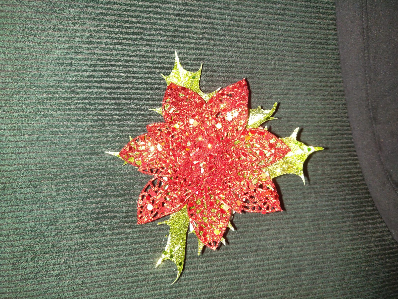 Red, glittered poinsettia on green holly leaves