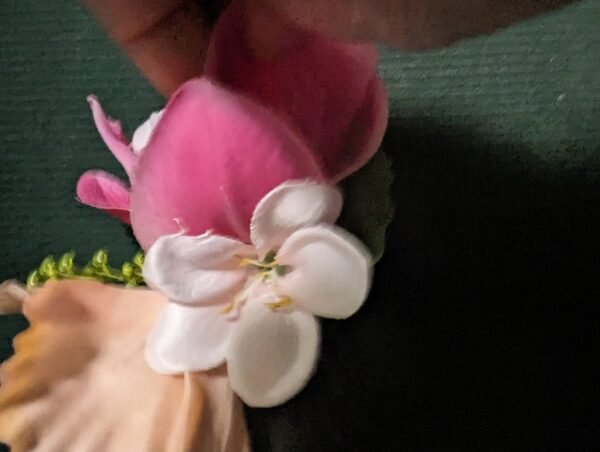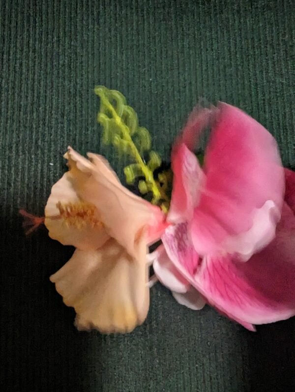 Peach Hibiscus, pink orchid and white plumeria